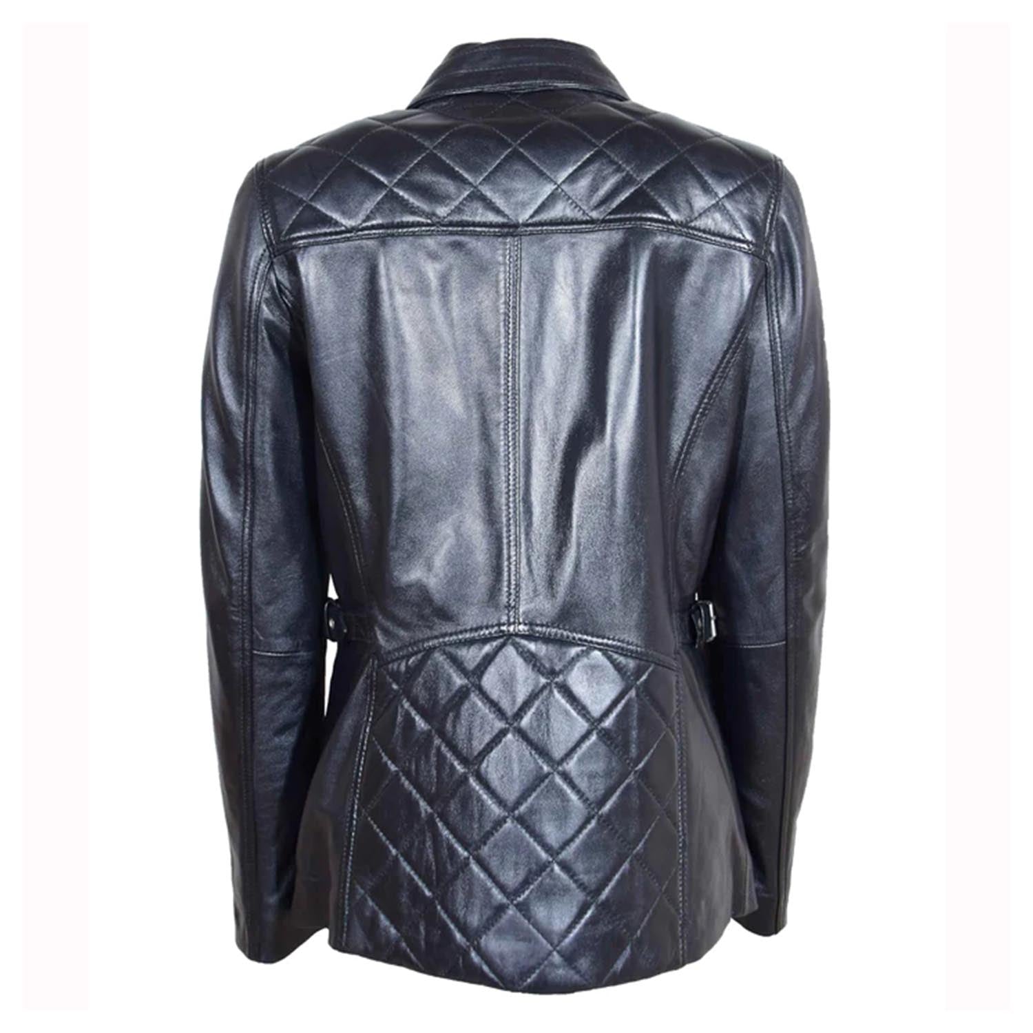 - Featuring a quilted design that oozes elegance, this leather blazer for women boasts four front pockets - two with zips and two with stud buttons - ensuring both practicality and sophistication.